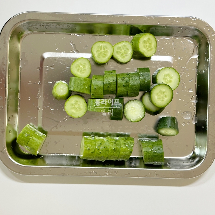 씻은 오이를 1~2cm 정도의 한 입에 먹기 좋은 크기로 잘라 주세요. 너무 얇으면 아삭함이 떨어지니 두께감이 좀 있는 것이 좋습니다.