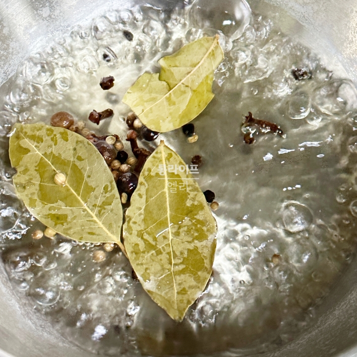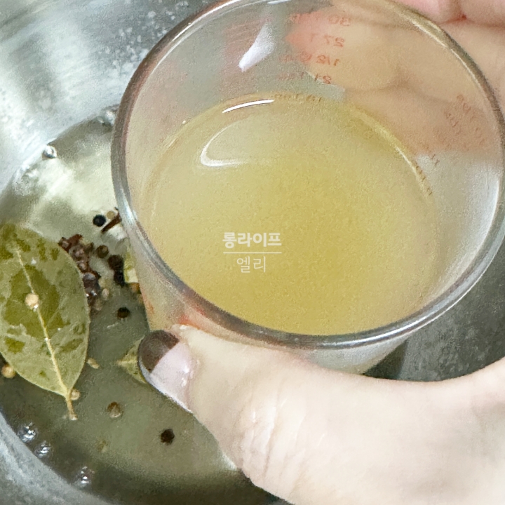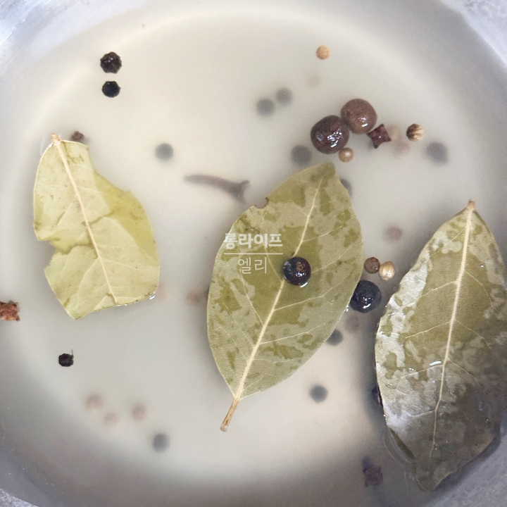 물 200ml, 소금 1ts, 월계수 잎 2장 (저는 3장 넣었어요), 피클링스파이스 약간 다 냄비에 넣어주세요. 애사비는 끓이고 나서 넣을 거기 때문에 애플 사이다 비니거를 제외하고 다 넣어주세요. 개인적으로 식초 냄새가 집에 진동하는 걸 싫어해요.