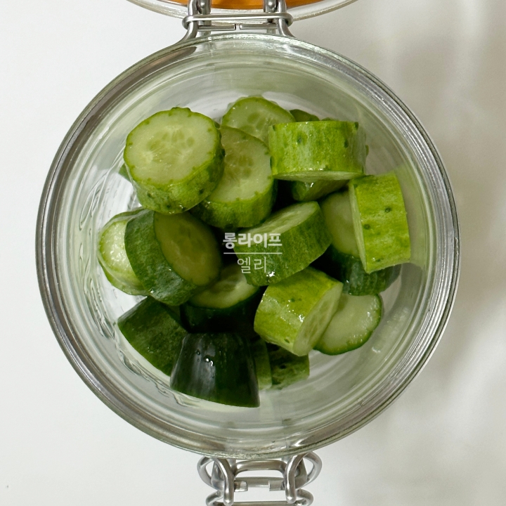 소독한 유리병에 자른 오이를 차곡차곡 넣어주세요.