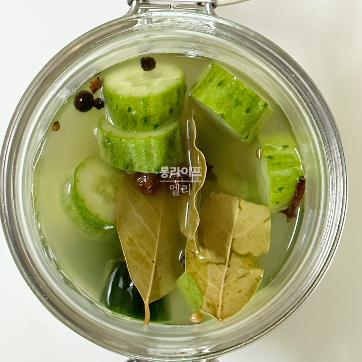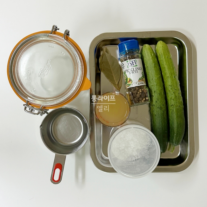 오이 2개, 소금, 물, 애플 사이다 비니거, 월계수 잎 2장, 피클링스파이스 약간, 끓는 물로 소독한 유리병