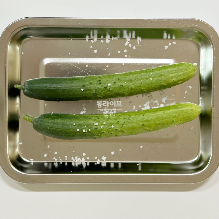 오이에 굵은 소금을 약간 뿌려서 문질러 오이 겉면에 이물질을 깨끗하게 닦고 물로 잘 헹궈서 씻어주세요. 기존에 상당히 식재료에 민감할 때는 렉틴을 제거하겠다고 오이껍질과 오이씨도 모두 제거를 했었는데요. 이제는 그냥 먹습니다.ㅎㅎ