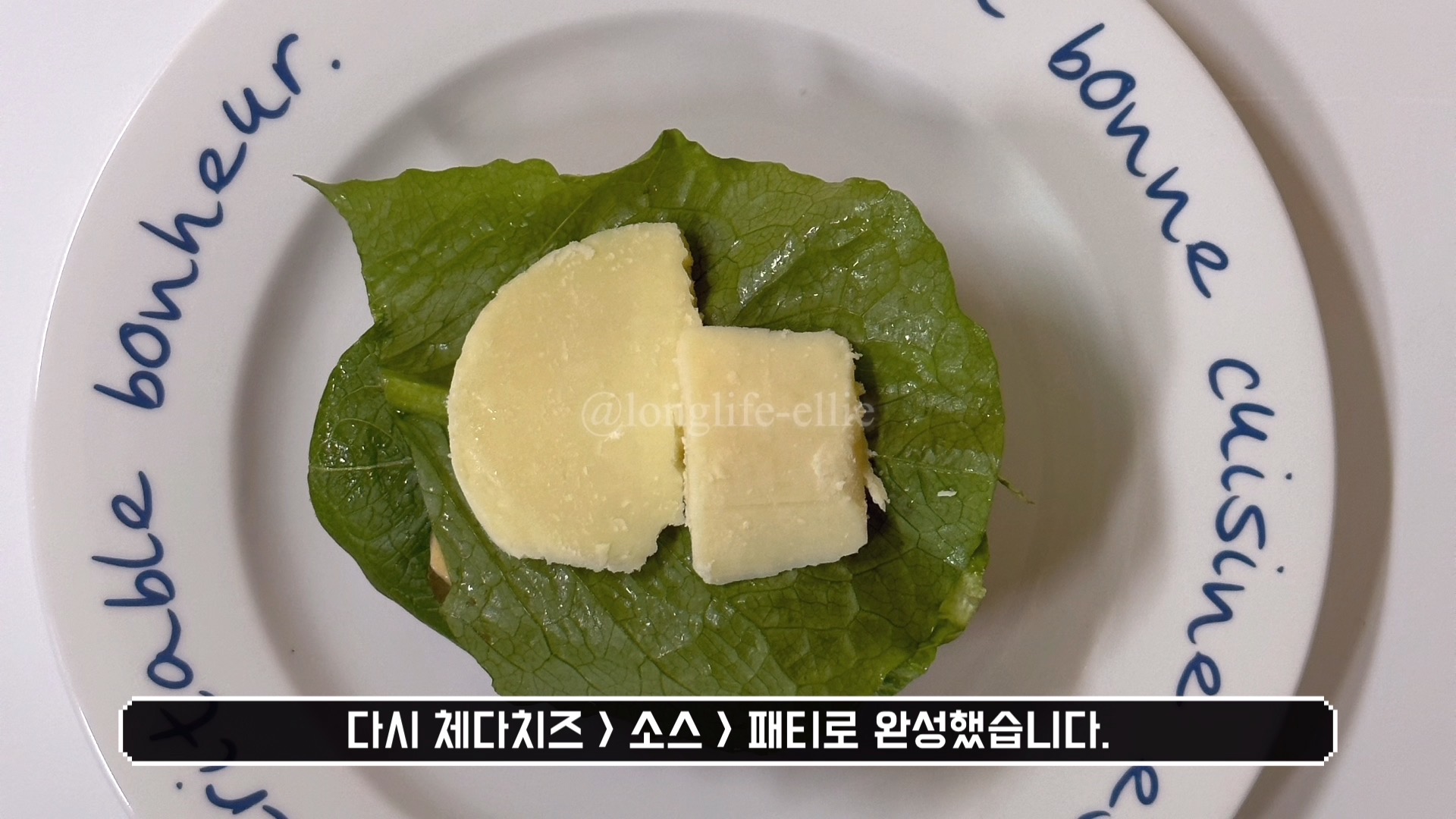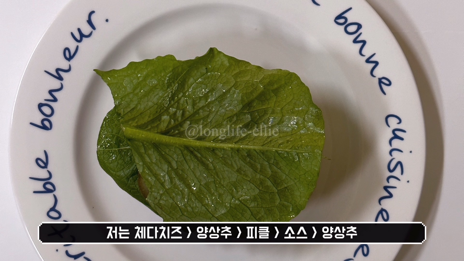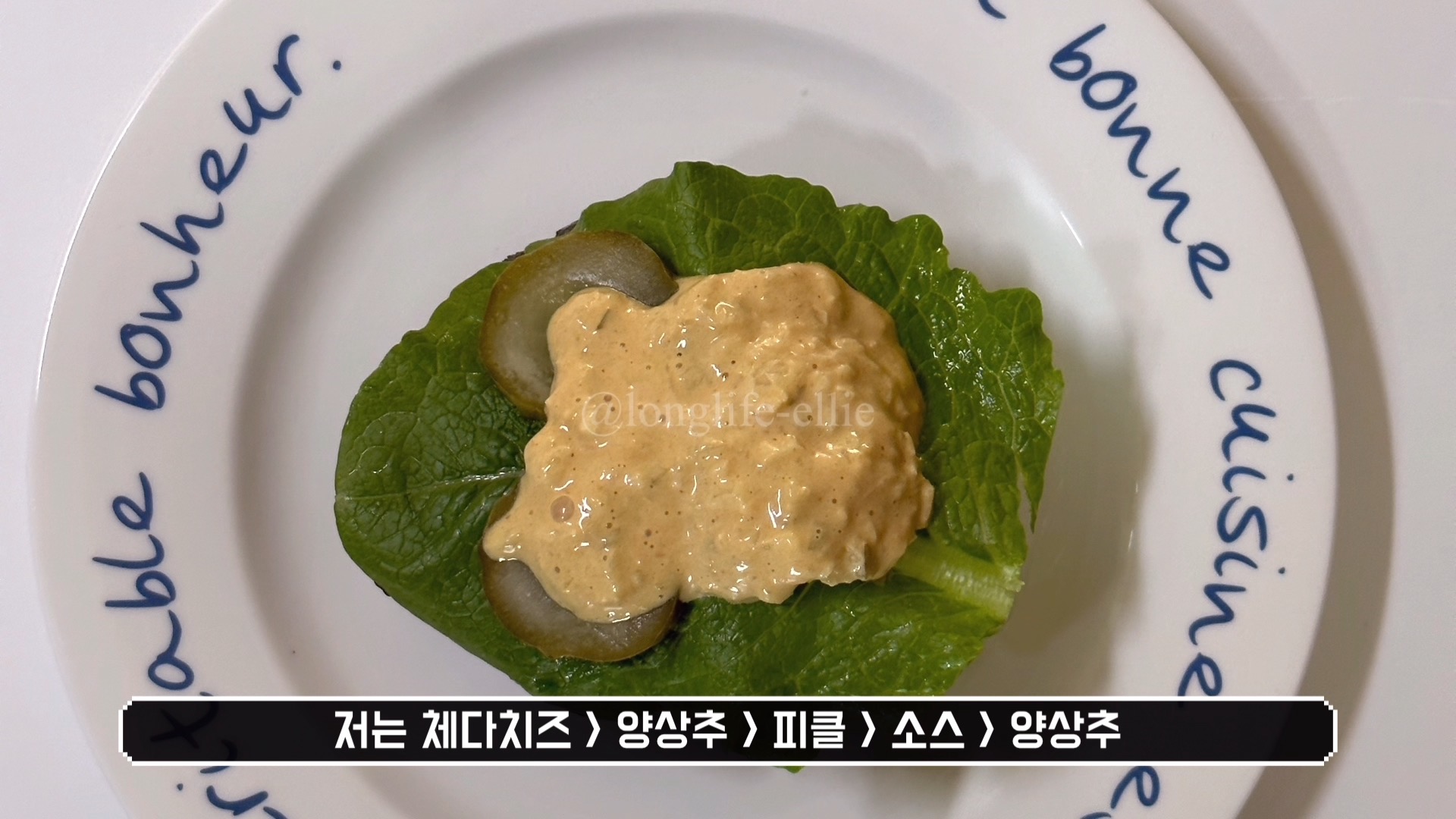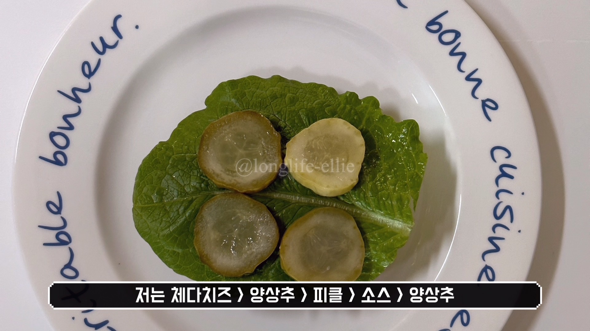 제가 체다치즈를 슬라이스용이 아닌 좀 성분이 좋은 것으로 나름 고른 것을 칼로 자르다 보니 모양은 저렇지만 맛은 좋았습니다. 그리고 제가 양상추를 별로 안 좋아해서 집에 없어서 대신 로메인을 넣었습니다.
