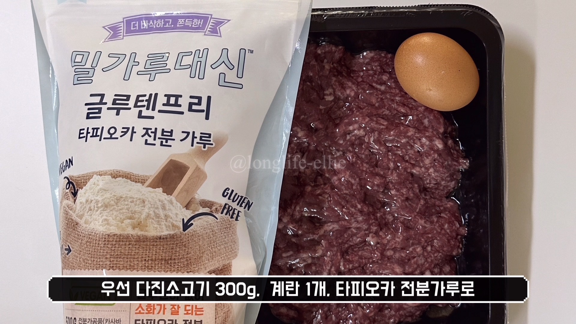 다진 소고기에 계란 1개를 넣고 잘 섞은 다음 패티 모양으로 빚어주세요. 그리고 앞뒤로 타피오카 전분 가루를 묻혀주세요. 차전차피 가루를 사용하셔도 무방하나 개인적으로 차전차피를 먹으면 복부 팽만감이 심해서 저는 쓰지 않습니다.