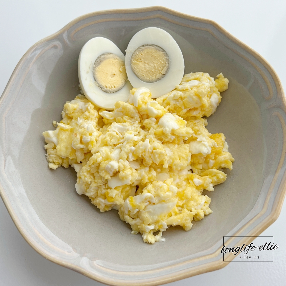 요리 하수인 저의 요리 실력을 인정하고 스크램블로 통일했습니다. 마지막 날은 하루 종일 스크램블만 해 먹기로 결심했습니다. 저녁은 계란 3개, 버터 40g으로 스크램블을 했습니다. 추가로 삶은 계란 남아있던 것 1개를 더 먹었습니다.