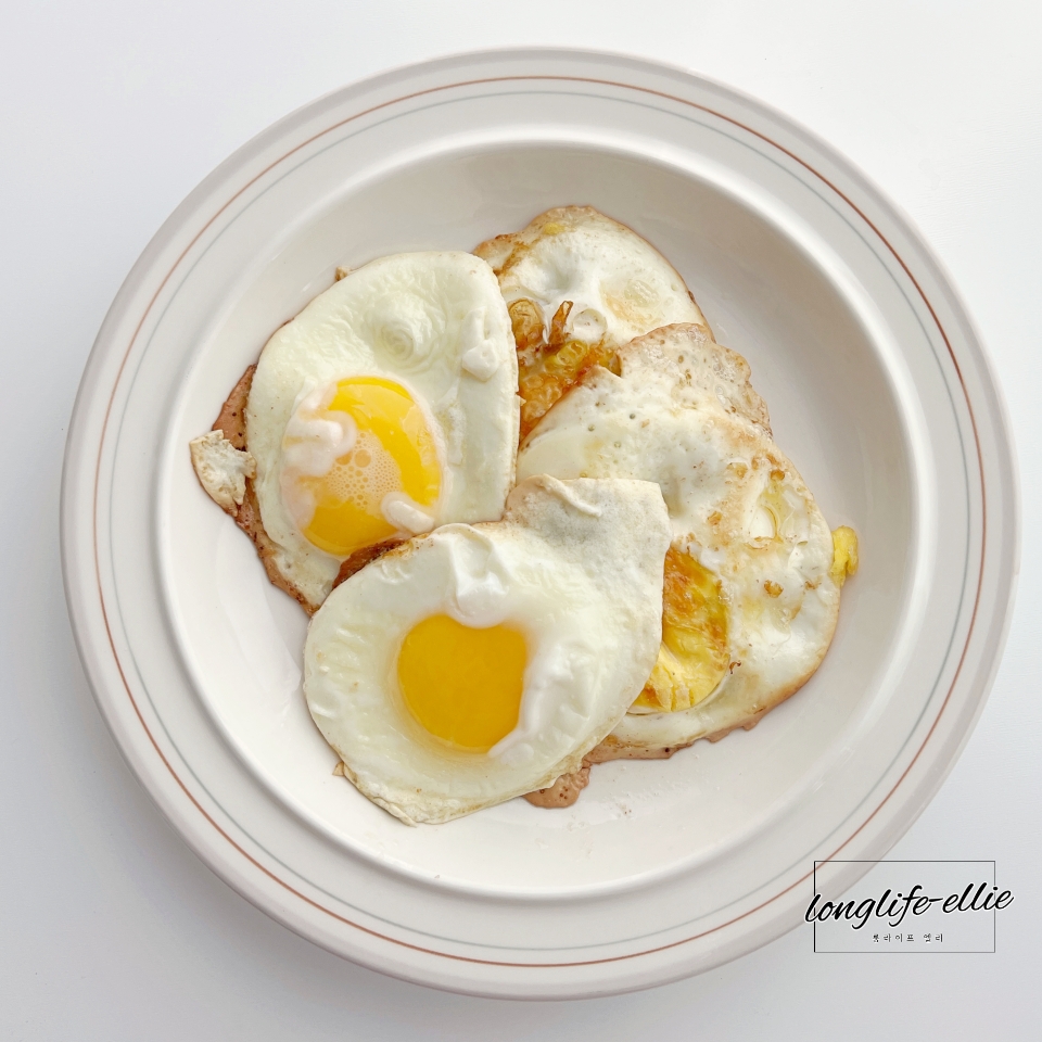 단조롭고 단조로운 식단이라 계란 4개를 계란 프라이를 해보았습니다. 다른 분들처럼 촉촉하고 예쁘게 만들고 싶었는데 저의 현실은 이렇게 완성되었습니다. 아마도 이것이 저의 최선이었던 것 같습니다. 개인적으로 완숙을 좋아하는 편이라 사진 찍고 더 익혀서 먹었습니다. 못생겨도 배 속에 들어가면 효과는 다 똑같은 거라 믿습니다! 계란 4개와 버터 50g 소금으로 간을 해서 완성했습니다. 달걀 후라이는 언제나 그래도 맛있어요.