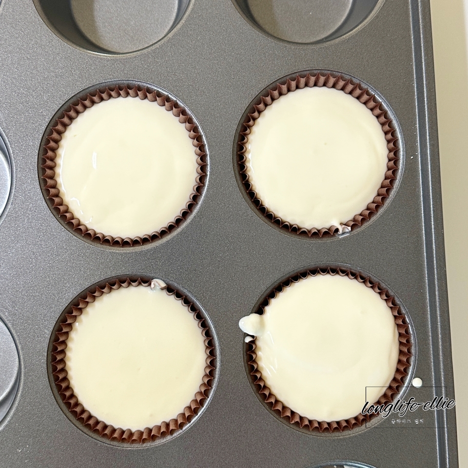 12cm 미니 원형 케이크 틀에 해도 높이가 너무 낮은 거 같아서 물론 양을 많이 만드신다면 상관 없지만, 저는 뭐든 질리지 않게 조금만 만드는 것을 선호합니다. 그래서 대신 머핀틀에 했습니다. 딱 4개 들어가네요! 자르지 않고 하나씩 먹으면 되니 꽤나 만족스럽습니다.